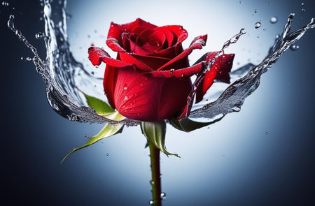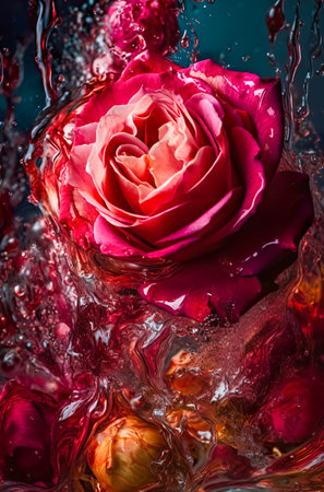 Capturing the Splash: Dynamic Image of Water Droplets Falling on a Rose. Concept Nature Photography, High-Speed Capture, Water Droplets, Floral Imagery, Macro Details
