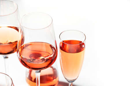 Rose wine of different shades in glasses on white background. Rosado, rosato or blush wines tasting