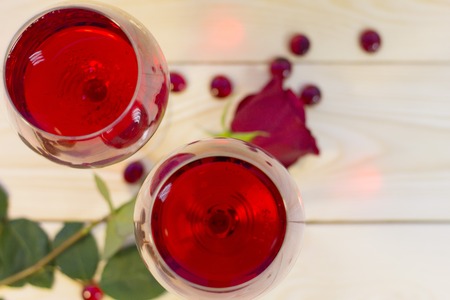 The concept of Love, Wedding, Proposal, Anniversary. Two glasses of red wine and a beautiful red velvet rose on natural wooden background, top view