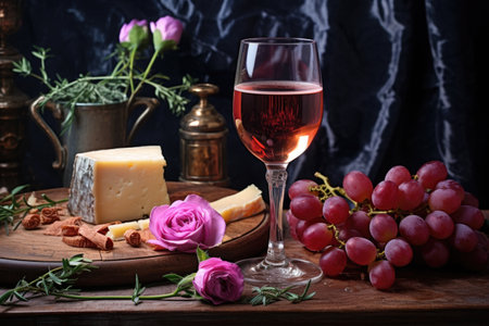 rose wine with cheese and grapes, created with generative ai
