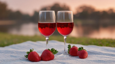 Two elegant wine glasses filled with a refreshing red drink sit near ripe strawberries, creating a serene summer scene by the lakeside at sunset.