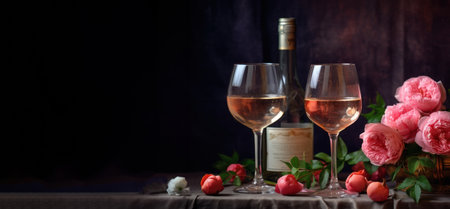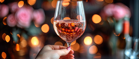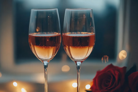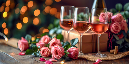 An intimate setting featuring sparkling rose wine glasses, delicate pink roses, and warm bokeh lights, creating a celebratory atmosphere.
