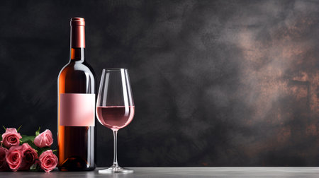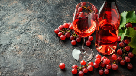 A glass of ros wine sits next to a bottle, surrounded by fresh red grapes and green leaves on a textured dark background, creating an inviting atmosphere for relaxation or celebration.
