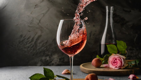 Wine pouring into glass with rose and peaches on dark background