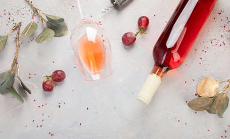 Bottle of rose wine on gray background. Summer drink for party, wine shop or wine tasting concept. Flat lay, top view, copy space