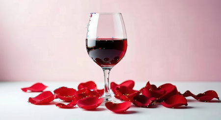 A stemmed glass filled with dark red wine sits on a white surface, with scattered red rose petals around it. Isolated on white background.