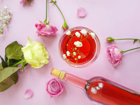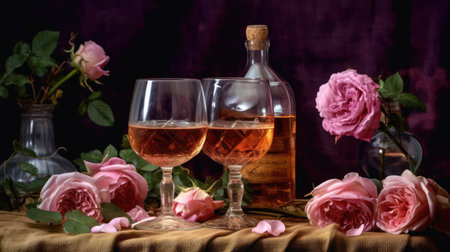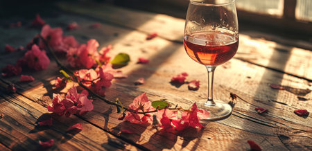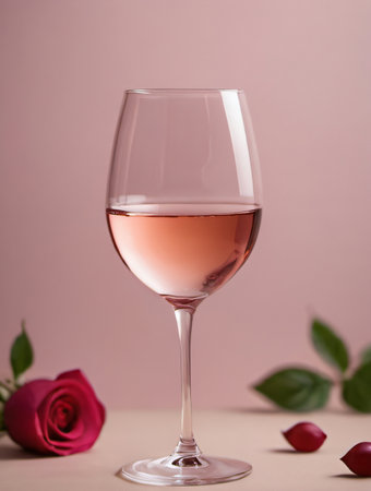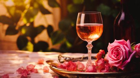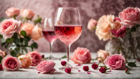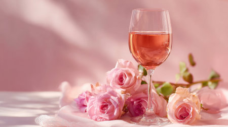 A beautifully arranged glass of ros wine is placed beside delicate pink roses, creating a romantic ambiance perfect for an evening gathering or celebration.