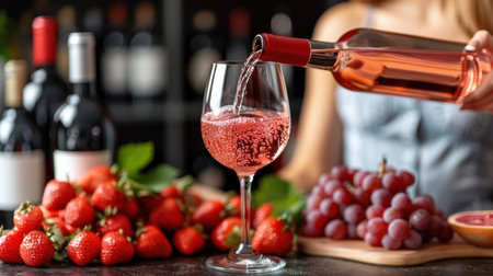 A beautifully arranged scene featuring a glass of rose wine being poured from the bottle, with fresh pink roses in the background.