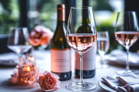 A bottle of rose wine is being poured into a wine glass on a table, showing the elegant stemware and the fluid movement of the liquid