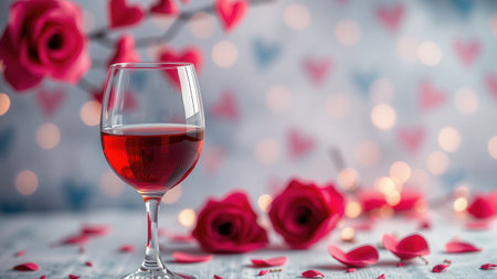 Romantic background with wine and rose petals. Ai generated.