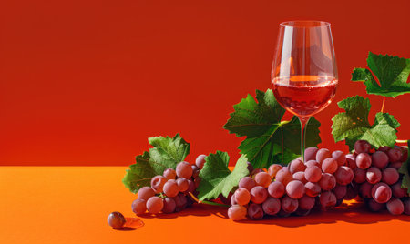 Grapes on a vibrant orange background with a glass of rose wine