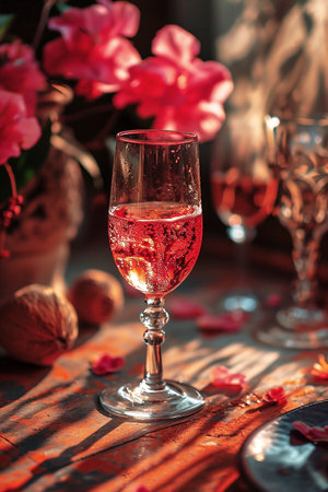 Crystal glass of rose sparkling wine or champagne on a table with pink flowers in a vintage style. Creative composition for your design. Generative AI.