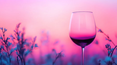 A glass of wine stands elegantly amidst blooming flowers as vibrant colors fill the sky at sunset, creating a peaceful and inviting ambiance in the garden.