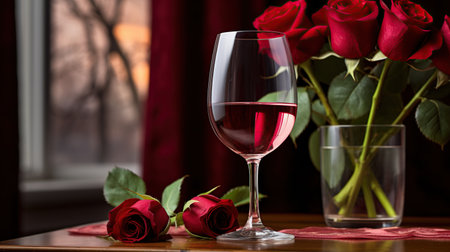Glass of rose wine and red roses on table in front of window