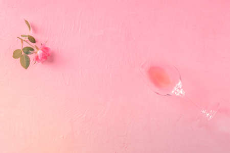 Romantic invitation design template with a glass of rose wine and a pink flower, top shot, flat lay with a place for text