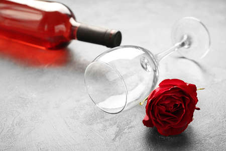 Bottle of wine, glass and rose on gray background