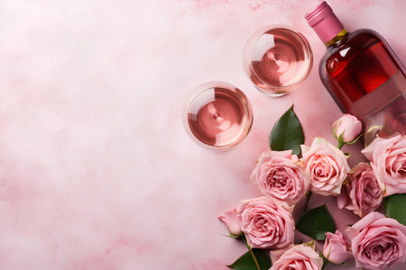 Wine bottle, glasses and roses on pink background. Top view with copy space