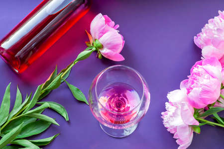 Creative summer composition with rose wine in a large glass and beautiful peonies on a dark background. Happy Mother's Day, International Women's Day. Valentine's Day. Flat lay.