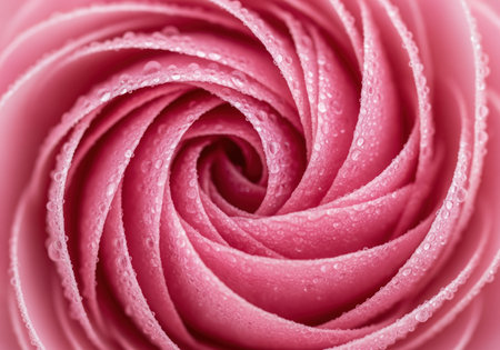 Delicate pink flower petals captured in an extreme macro close up, showing a perfect spiral formation and texture covered with fresh water droplets.