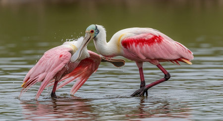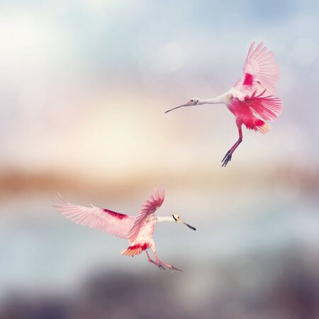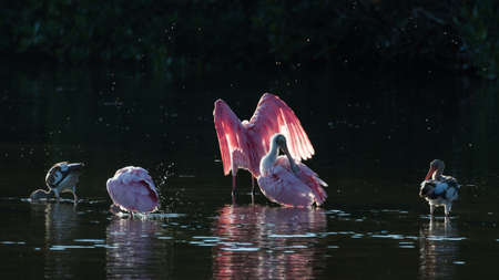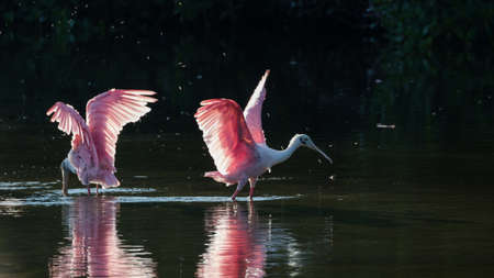 Roseate Spoonbills (Platalea ajaja) in the golden hour, J.N. ''Ding'' Darling National Wildlife Refuge, Sanibel Island, Florida