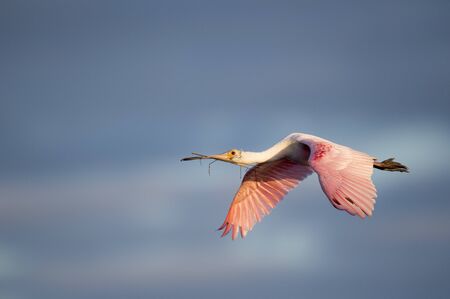 A bright pink Roseate Spoonbill flies in the golden morning sunlight with nesting material in it's beak with a dark cloudy background.