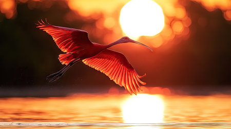 A vivid scarlet ibis flying above a reflective lake at sunset, the bright red of its feathers contrasting with the warm orange hues of the setting sun