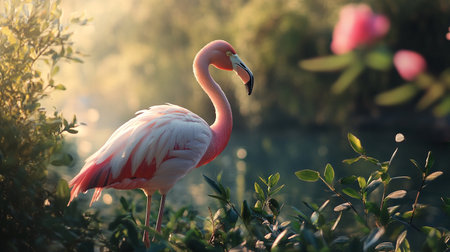 Pink flamingo stands in a lush green field by a body of water. The scene is serene and peaceful, with the bird being the focal point of the image