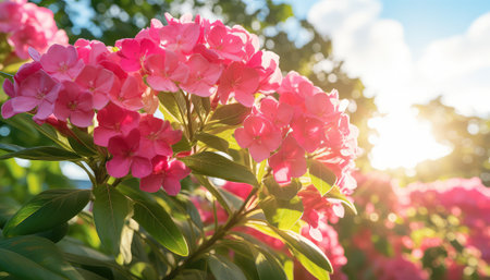 Bright pink flowers adorn lush green leaves in a sunny garden.