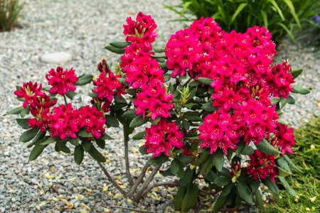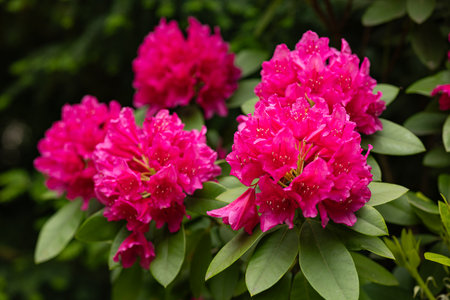 Bright pink rhododendron flowers blooming in lush green garden during late spring season. Floral beauty, botanical diversity, ornamental gardening and colorful landscape nature design