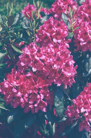 Closeup of beautiful pink rhododendron flowers bloom bush. Summer floral foliage composition