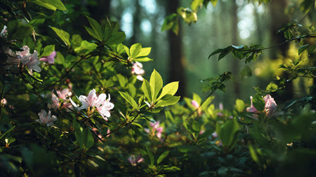 Beautiful close up of vibrant pink rhododendron flowers flourishing amidst a tranquil forest scene, bathed in soft sunlight filtering through the trees.