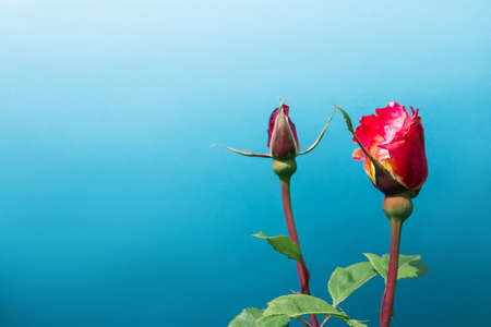 Red and orange rose flowers on a blue colored background. Flat lay style.