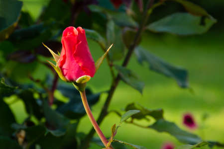 Young bud of a red rose on a stem on warm summer sun background