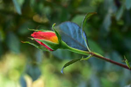 Beautiful red yellow rose bud on a green background in the garden. Ideal for a greeting card