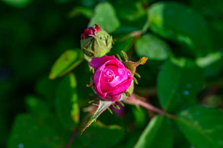 Pink Rose and Rosebuds in Garden, Close Up, Selective Focus. Rose blooms on a background of green leaves. Summer flower. Natural background.