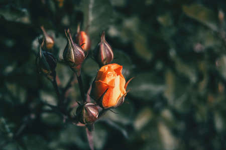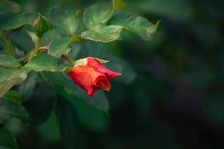 Top view of one budding red rose flower in the garden in dark tone; soft and selected focus with copy space.