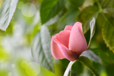 Delicate pink rose bud surrounded by green leaves