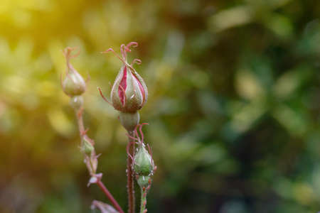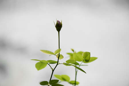 Delicate Bud on the young fresh sprig of roses. The first sprouts. Origin of life