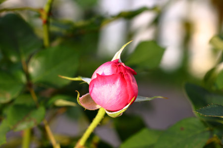 A captivating close-up of a pink rosebud, bathed in soft sunlight, showcasing its delicate beauty and intricate details against a blurred background.