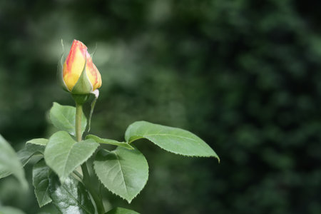 Yellow-red rose bud in the garden close-up