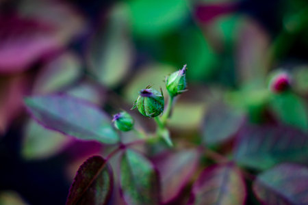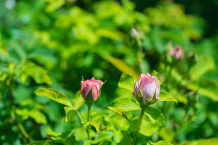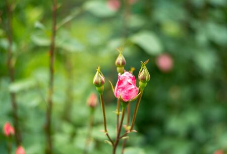 A selective focus shot of beautiful unbloomed pink garden roses growing on the blurry bush