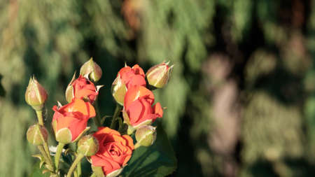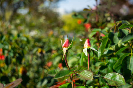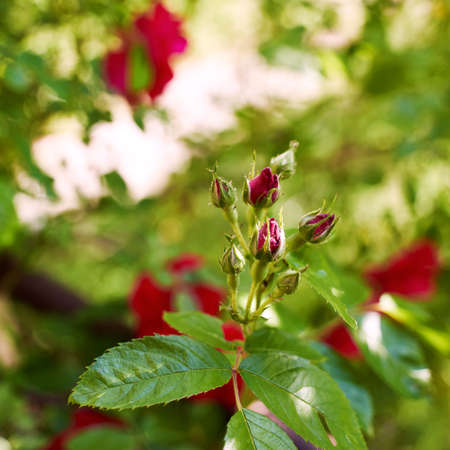 Red rose buds on the green bush on the blur garden background.