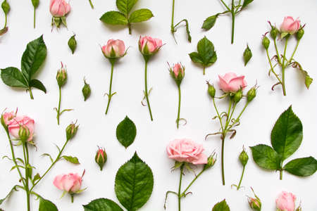 Decorative pattern with light pink gentle roses, leaves and buds on white background. Flat lay, top view, view from above