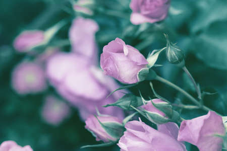 Decorative climbing roses of pink color close up, filtered background.