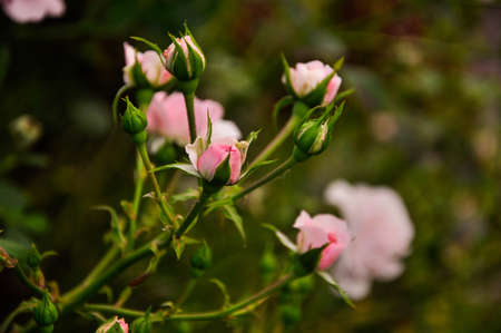 Pastel pink fragrant roses in a garden. Rosebuds on a flowering shrub in summer. Gardening, horticulture, floriculture, plants and flowers grow and care concept. Beautiful floral wallpaper Copy space.