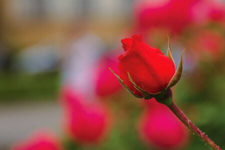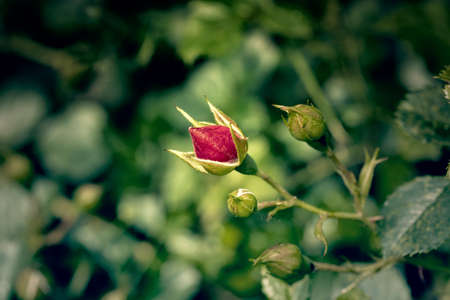 Red Rose Bud. New rose bud. Young graceful spray rose. A small bud of a blooming flower. magic garden. Natural background. beautiful flower, on a flowerbed, close-up. space for text
