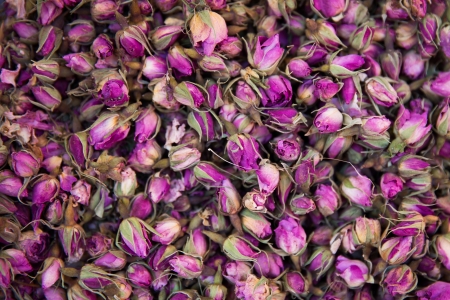 Dried rosebuds background texture closeup. Pink rosebud macro close up of heap.