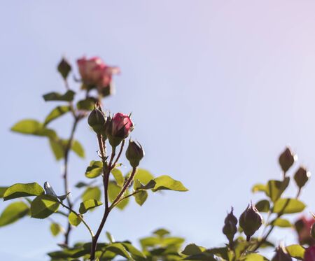 Blurry beautiful Valentine Rose Bud Nature Love Background, Beautiful pink roses on tree bush leaves. Vintage tone. Copy spase. Blurred.