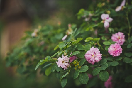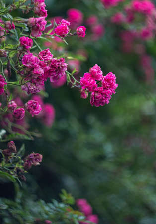 Decorative climbing roses of pink color close up, filtered background.