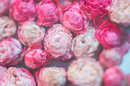 Festive flower decoration. Dried roses mix. Defocused floral background.